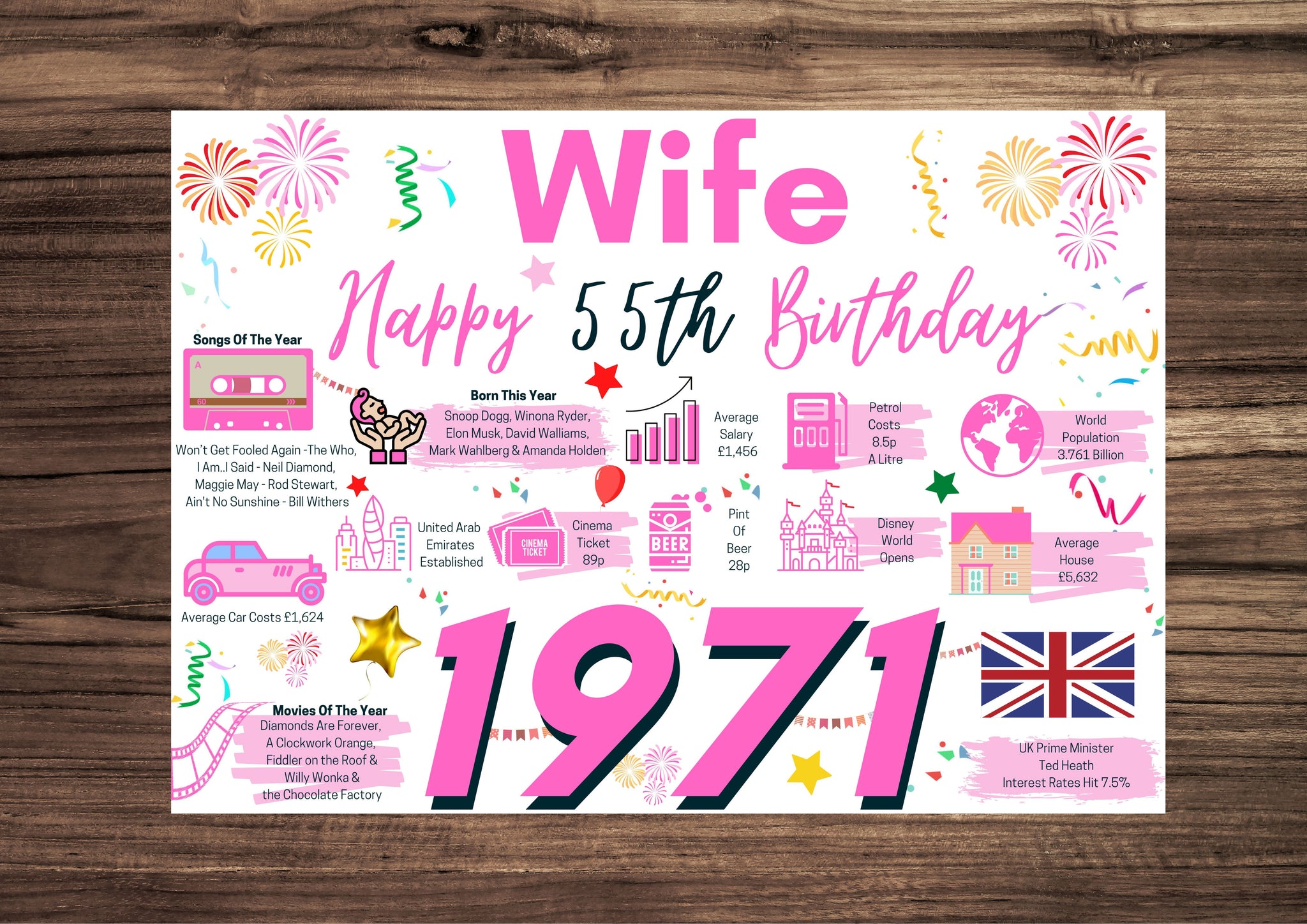 55th Birthday Card For Wife, Born In 1971 Facts Milestone