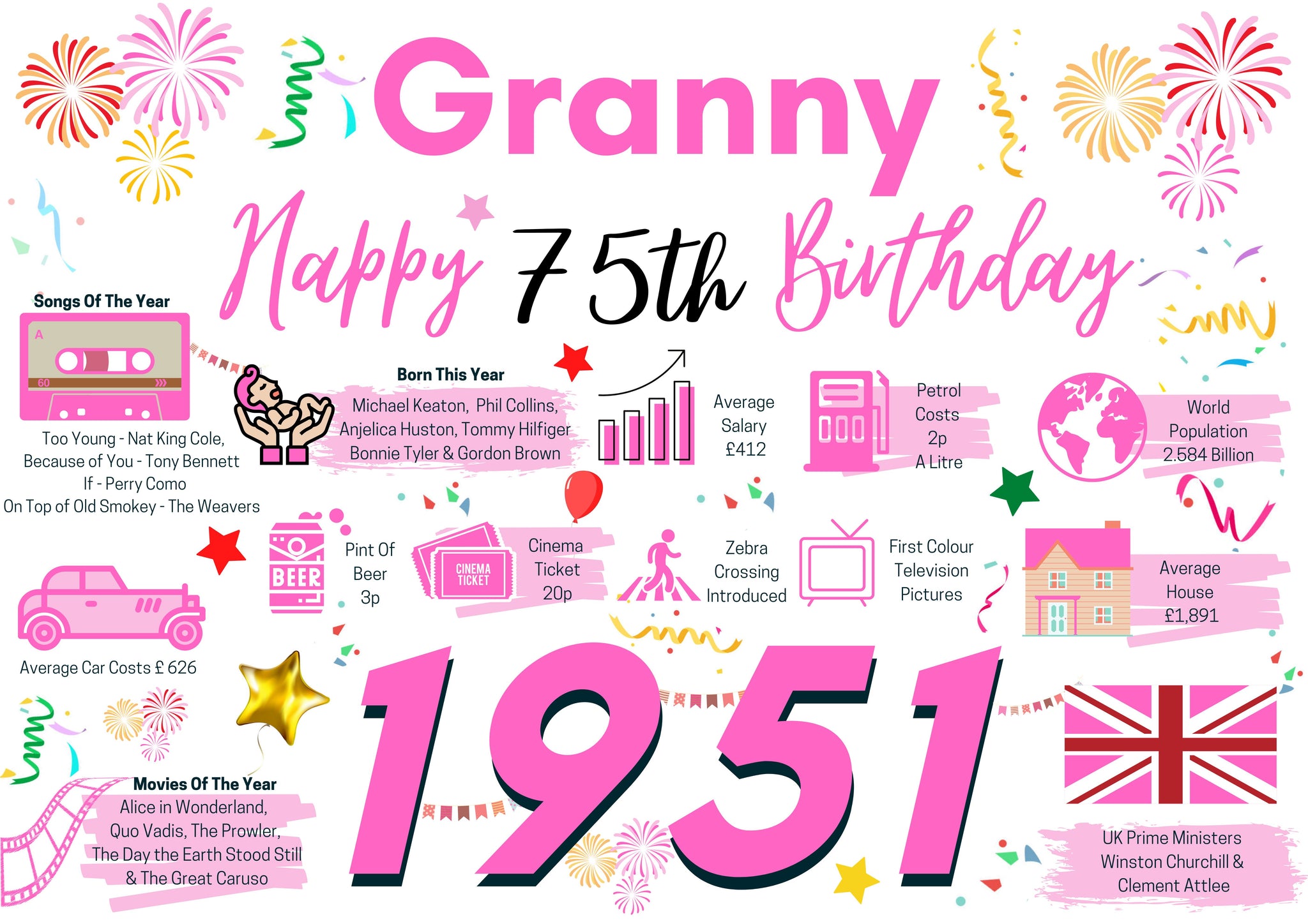 75th Birthday Card For Granny,75 Birthday Card For Her, Born In 1951 Facts Milestone