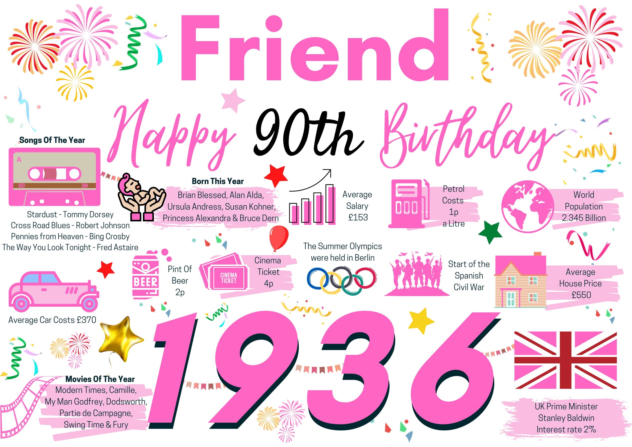 90th Birthday Card For Friend, Happy 90th Greetings Card Born In 1936 Facts