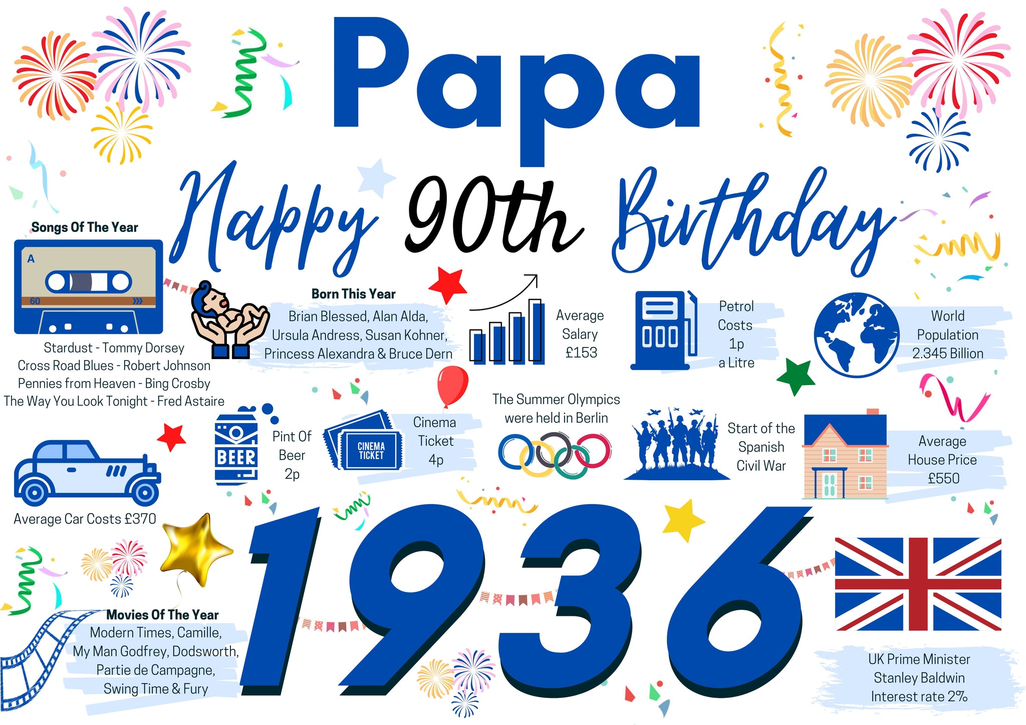 90th Birthday Card For Papa , Birthday Card For Him, Born In 1936 Facts
