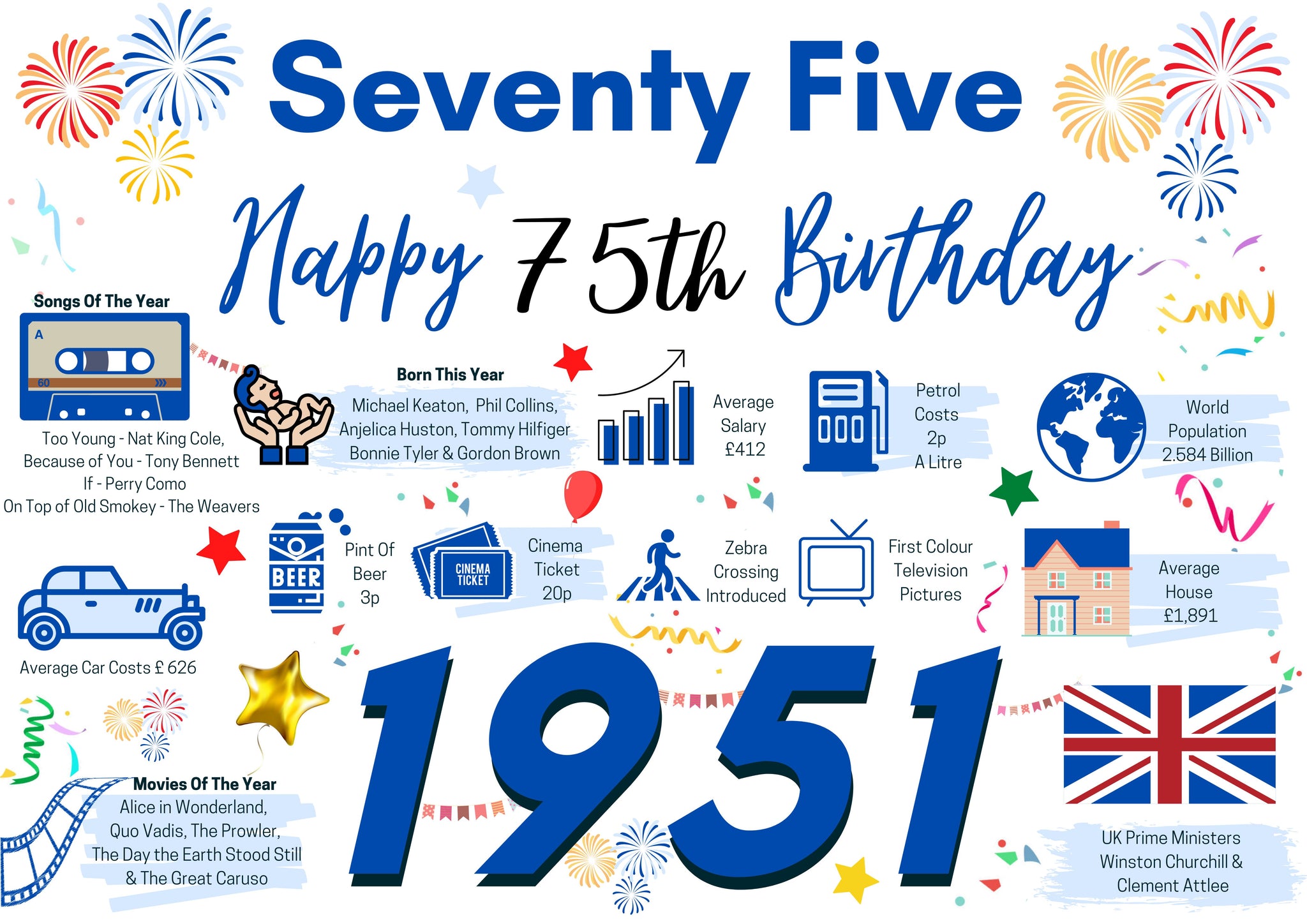 This "Year You Were Born" birthday card is a great way to remember the events that happened 75 Years ago in 1951.