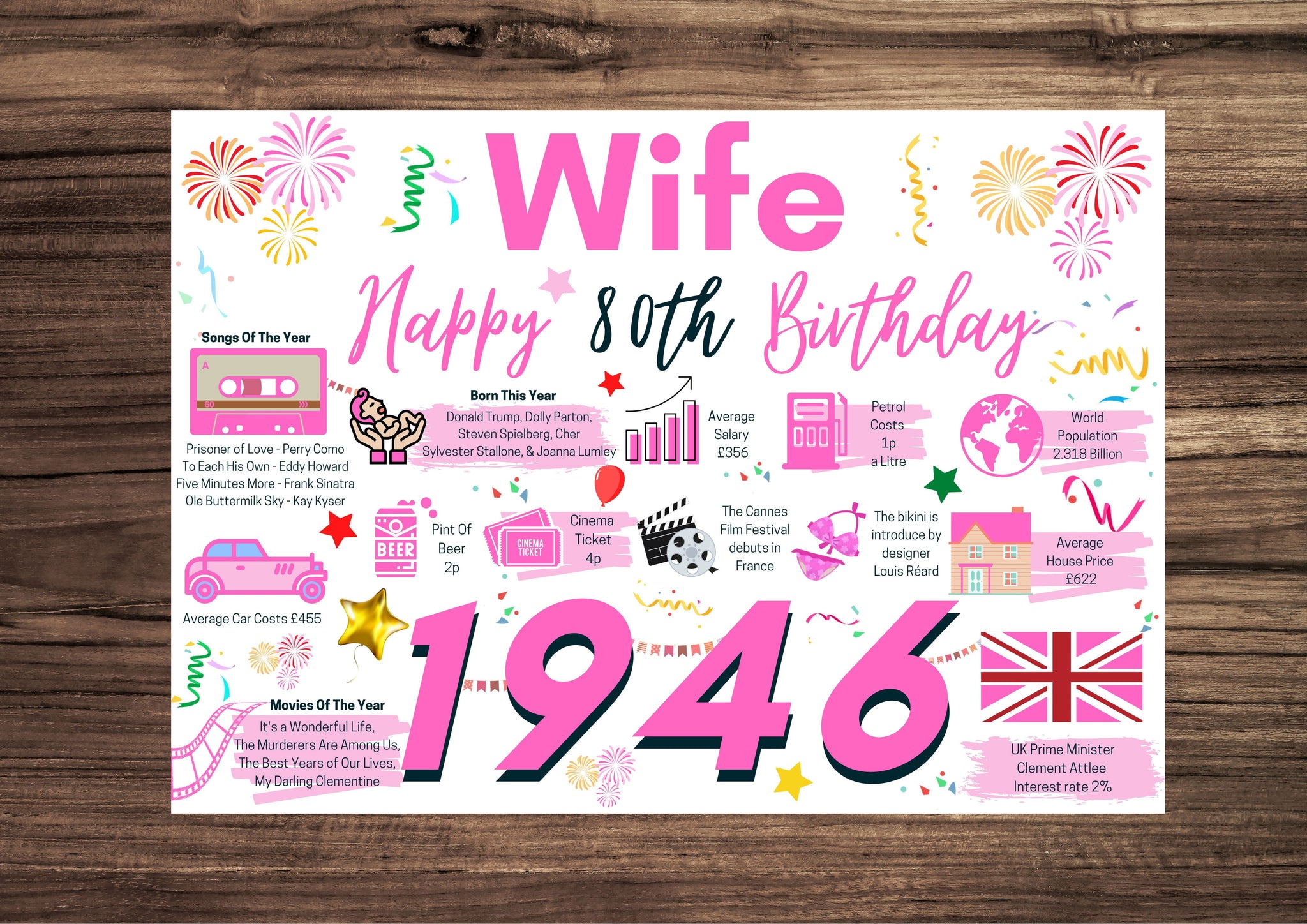80th Birthday Card For Wife, Born In 1946 Facts Milestone