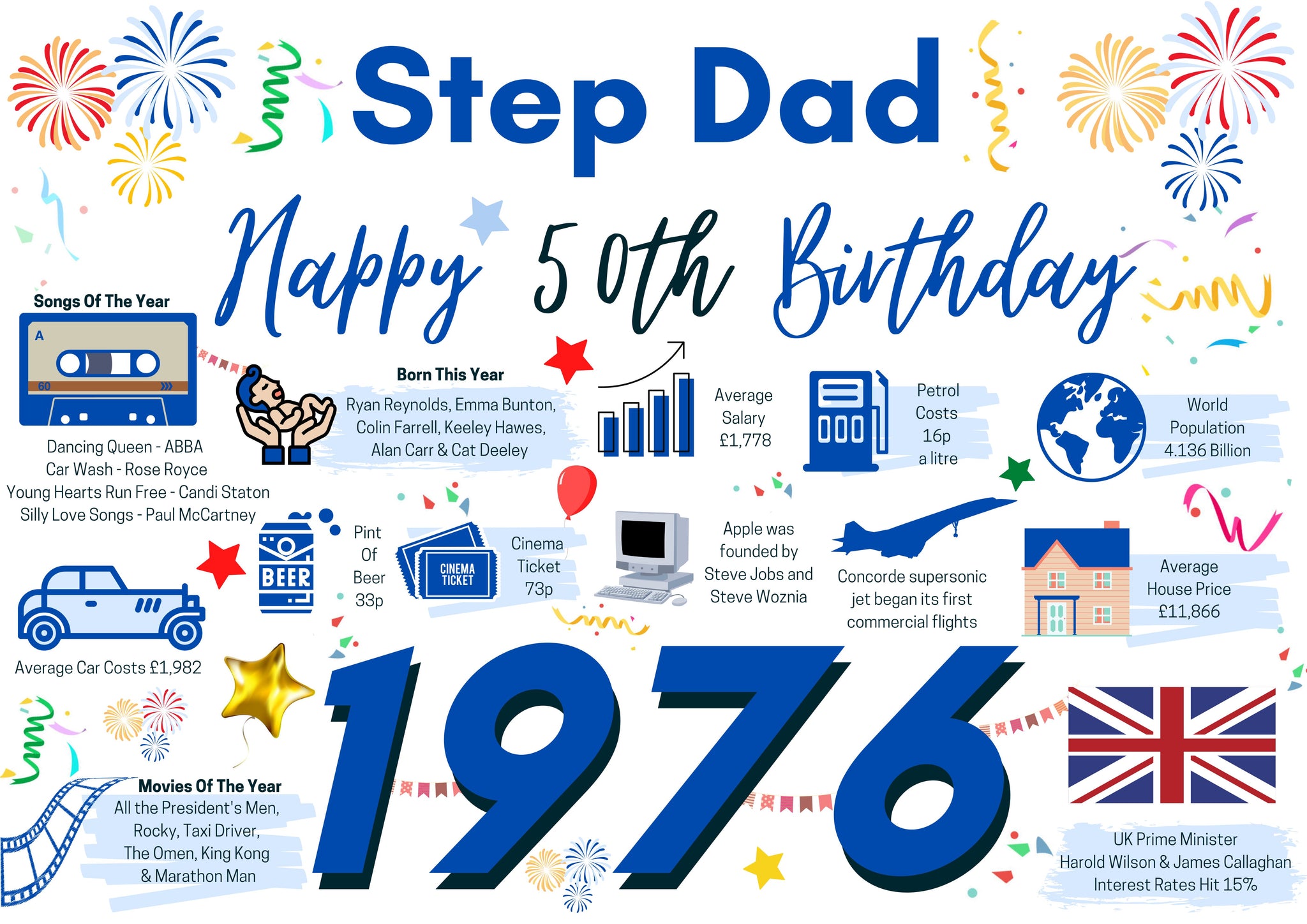 50th Birthday Card For Step Dad, Born In 1976 Facts Milestone