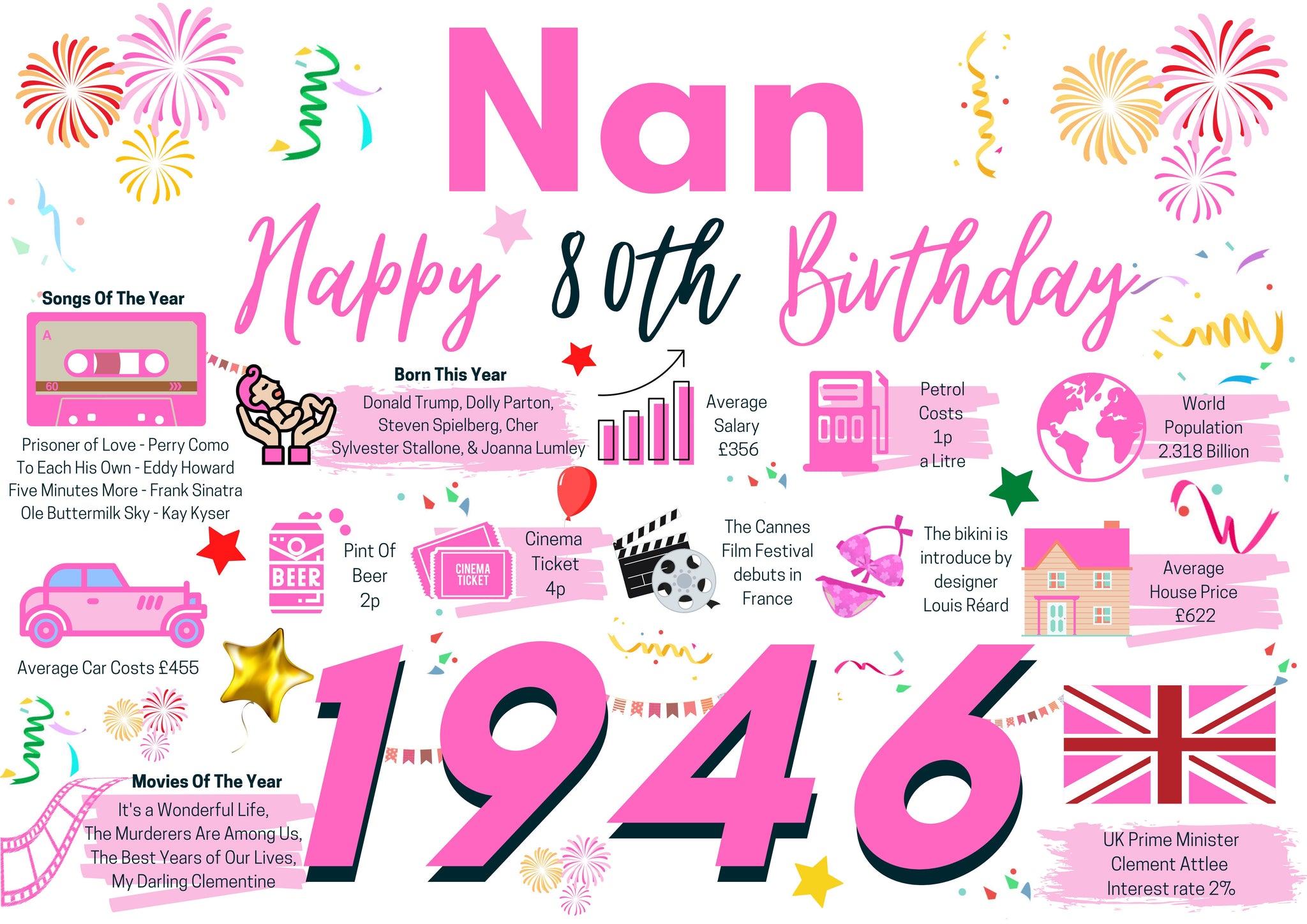 80th Birthday Card For Nan, Born In 1946 Facts Milestone