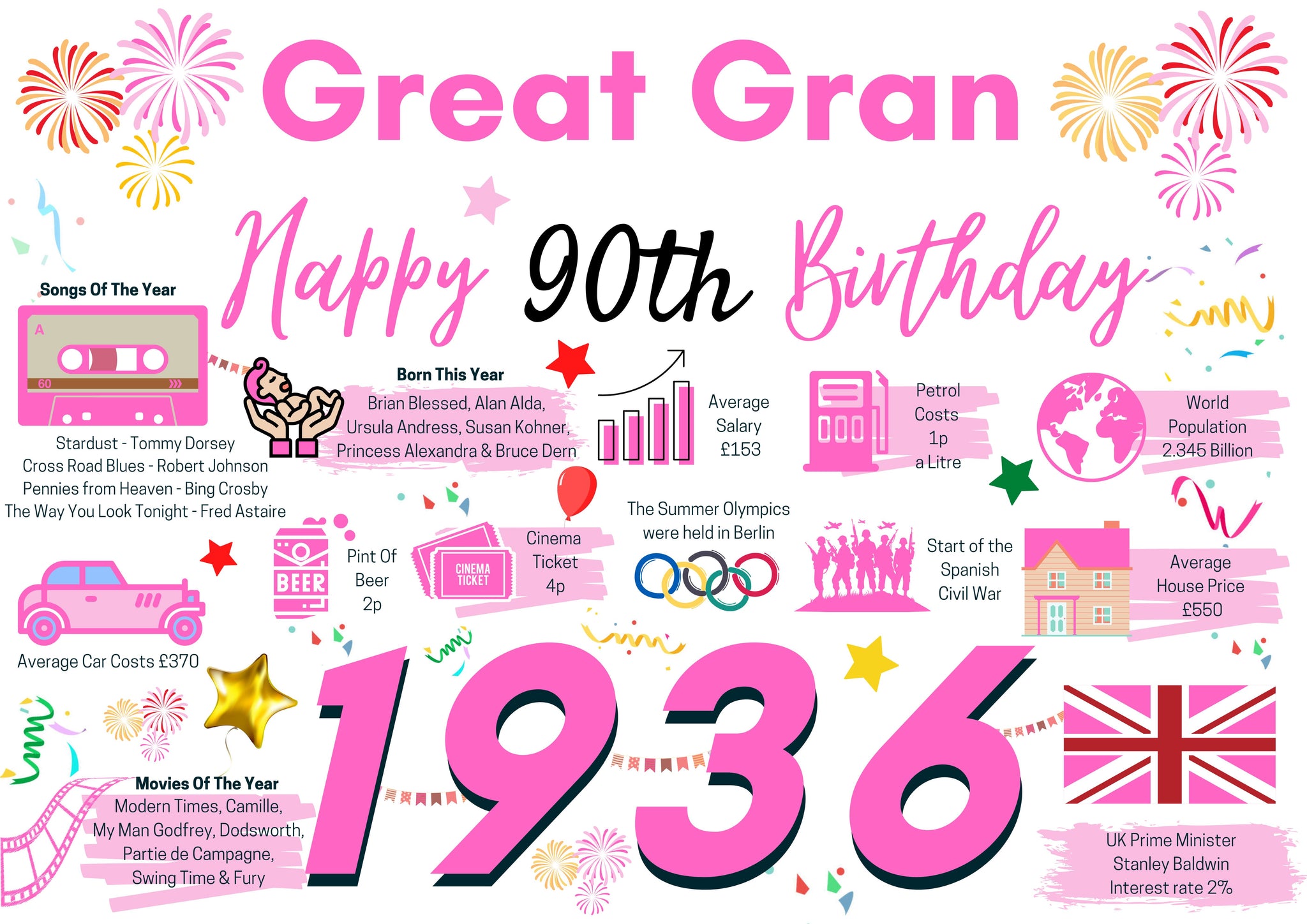 This "Year You Were Born" birthday card is a great way to remember the events that happened 90 Years ago in 1936.