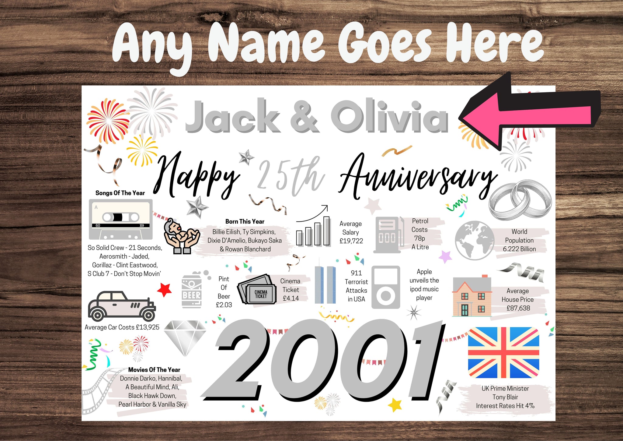 This 25th Anniversary card is a great way to remember the events that happened 25 Years ago in 2001.