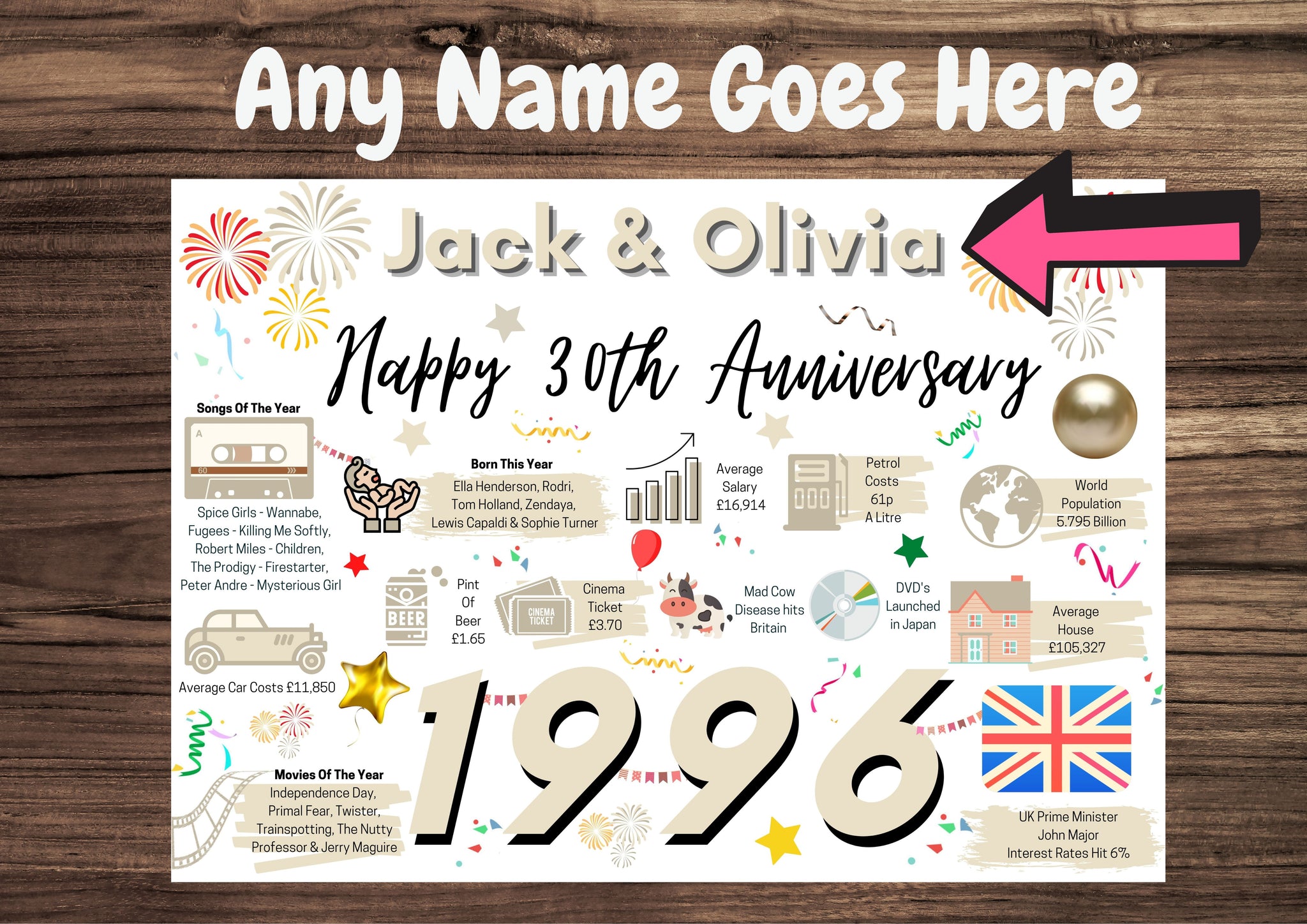 This 30th Anniversary card is a great way to remember the events that happened 30 Years ago in 1996.